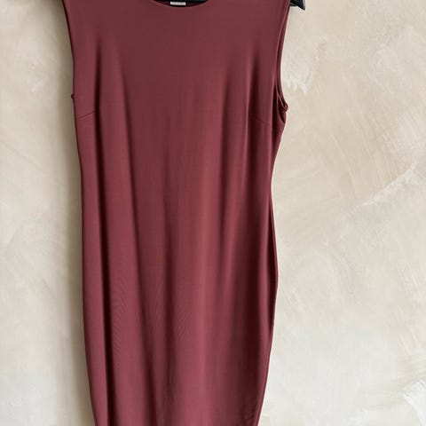 Enkel og klassisk silkekjole med tilhørende tørklæde. Farven er i changerende brun. Kjolen er i to lag