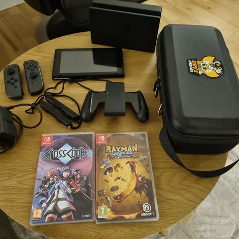 Switch uden ridser i skærm da der har siddet panzerglas på, 3 spil, uoriginale controllersæt, samt dock osv så du er klar til at komme i gang