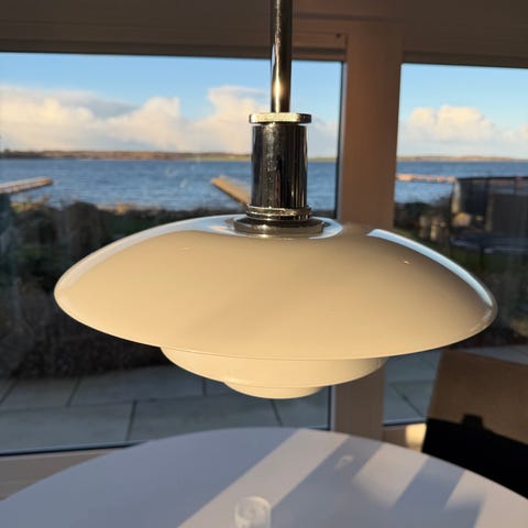 2 Smukke PH-lamper 4 1/2-4 som passer over et stort spisebord. Der er monteret pendeladaptere, så de passer til medfølgende strømskinne. Kan flyttes i strømskinnen, så det passer bl.a. til et stort Piet Hein bord fra 6 pers op til min. 12 pers. Sælges pga flytning til mindre bolig.