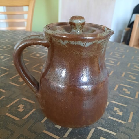 Vintage kande med et dekorativt design af solsikker og grønne blade. Kanden har en struktur, der minder om fletværk, og et håndtag formet som en grøn stilk. Materialet er keramik, og kanden er velegnet til servering af drikkevarer.