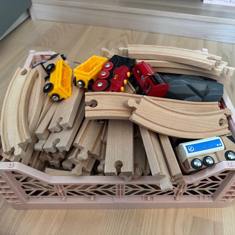 BRIO trælegetøj togbane sæt bestående af træskinner og små togvogne i forskellige farver. Sættet er designet til børn og kan bruges til at bygge og lege med togbaner.