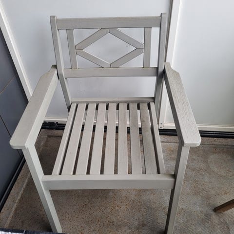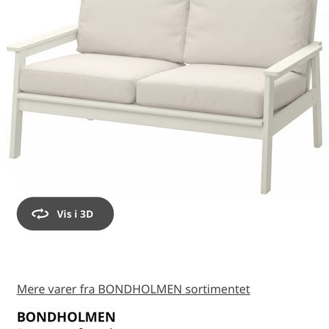 Stolene er af typen BONDHOLMEN med hvide/beige hynder (ny pris: 1295 x2 = 2590 DKK, link: https://www.ikea.com/dk/da/p/bondholmen-laenestol-ude-hvid-beige-froesoen-duvholmen-beige-s29578307/)