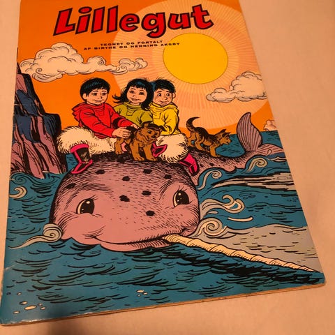 Lillegut børnebog med illustrationer af børn og dyr foran bjerglandskab. Bogen er velegnet til børn og indeholder historier eller fortællinger tilpasset yngre læsere.