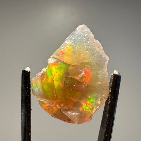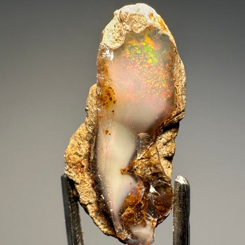 Rå australsk boulder opal i mørk jernstensmatrix med synligt blågrønt farvespil. Opalen ligger som en naturlig åre tæt ved overfladen og fremstår flot med forskellige farver. Velegnet både som samlerstykke og til videre slibning, særligt til boulder-cabochoner hvor matrix indgår i udtrykket.