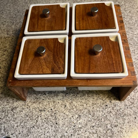TripTrap opbevaringsglas i fin stand. Låg i teaktræ med messingknop.