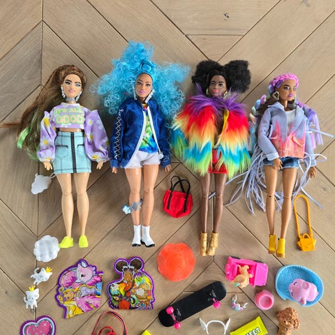 Barbie Extra dukke sæt med pink hår og blå jakke. Sættet inkluderer en dukke med stilfuldt tøj og tilbehør, herunder solbriller og et kæledyr. Perfekt til kreativ leg og styling.