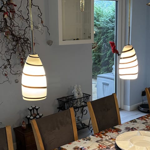 Sæt bestående af to pendellamper med sort kant og hvid ledning. Lampeskærmene er cylindriske og har en enkel, funktionel udformning. Passer til ophæng i loft og kan anvendes til belysning i hjem eller arbejdsrum.
