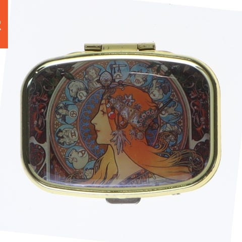 MEGET ELEGANT PILLEÆSKE med en smuk kvinde med en elegant hat. Virkelig flotte farver! Motivet er under (plexi)glas og æsken indeholder to rum, se billede nr. tre. Æsken er sølvfarvet og den er 4x5,5 cm. Pilleæsken er helt ny. Vægt 32 gram