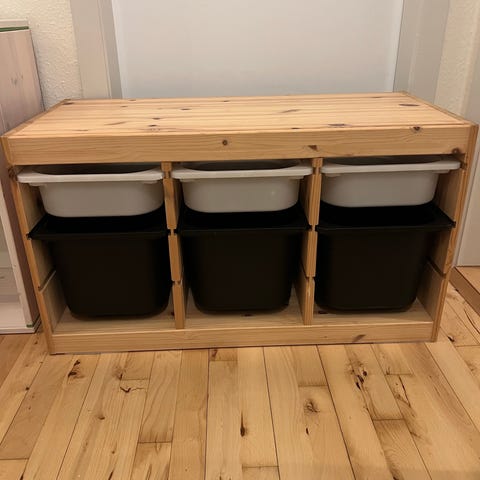 IKEA børnemøbler opbevaringssystem med orange og grønne kasser