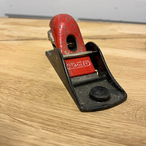 Middelstor blokhøvl i metal med ekstra høvljern (kopi af Stanley 130). Høvljernet kan flyttes så høvlen kan bruges som næsehøvl.