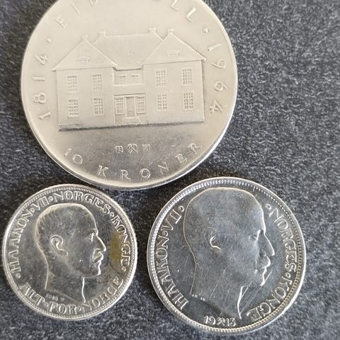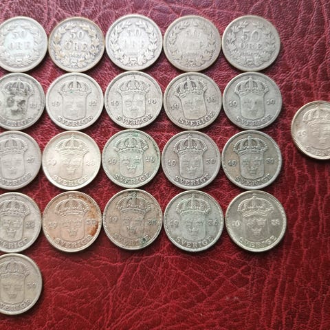 Sæt bestående af 11 svenske 1 kroner med forskellige årstal og motiver. Mønterne er af sølv og har en diameter på ca. 2-3 cm. Velegnet til samling eller som dekorative genstande.