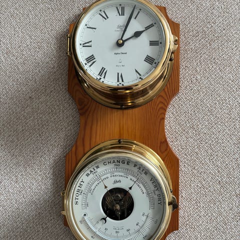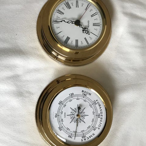 Sæt bestående af ur og barometer i messinglook af mærket Westo. Ø 185 mm H 55 mm