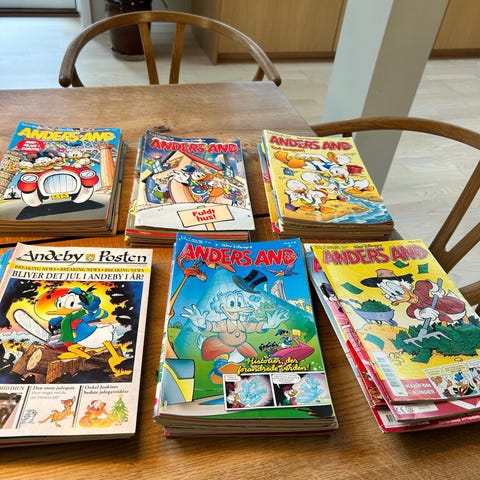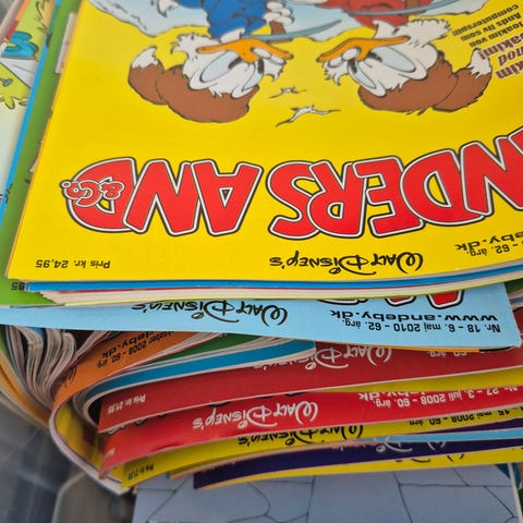 I den mappe kan evt. indsættes bunken af løse Anders And blade, som medfølger og udgør ca. 30 stk. Det er enkeltblade fra forskellige årgange og specialudgaver.