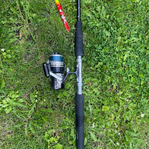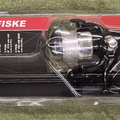 Okuma Classic fiskesæt bestående af en fiskestang og hjul. Sættet inkluderer forskellige fiskekroge og blink som tilbehør. Stangen og hjul er beregnet til pirkefiskeri.