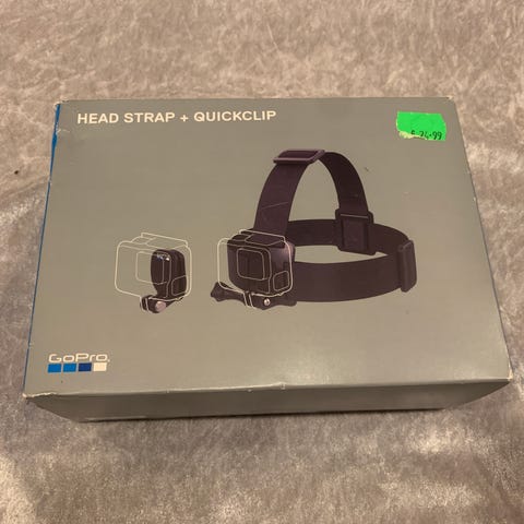 GoPro tilbehør inkluderer en justerbar bærestrop og et blåt opbevaringsetui med skumindlæg til beskyttelse og organisering af udstyr. Bærestroppen er designet til at fastgøre kameraet sikkert under brug.