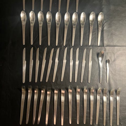 Georg Jensen/Arne Jacobsen cocktailgafler i rustfrit stål. Sættet består af 13 gafler, hver med en lang, slank form og to spidser i den ene ende og ske i den anden egnet til servering af små snacks og appetizers.