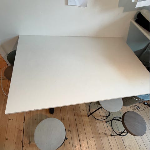 Velfungerende men med lidt mærker/patina på bordpladen. En gang slibning og efterfølgende lakering, vil nok kunne gøre underværker.