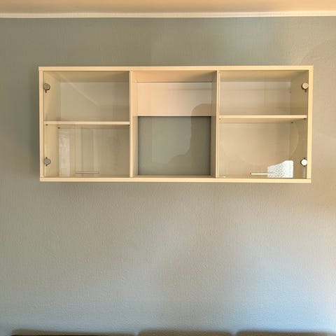 2 hvide hænge vitrine skabe med glashylder. Kan passe til dvd, cd. Eller kopper, glas og skåle (11-12cm) der er sat en "diamant" knop på for et mere feminint udtryk. Men de gamle knopper medfølger, samt extra glas hylder.