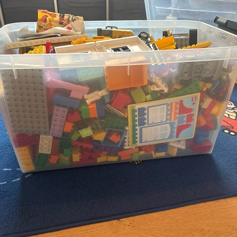 blandede klodser, plader, specialklodser, køretøjer, figurer og dyr. Samlingen indeholder sættene: Dukkehus 10505, Disney Tornerose 10542, Cargo fly 5594. Hvis du er interesseret i enkelte dele, er det muligt at aftale forsendelse. Ellers kun afhentning.