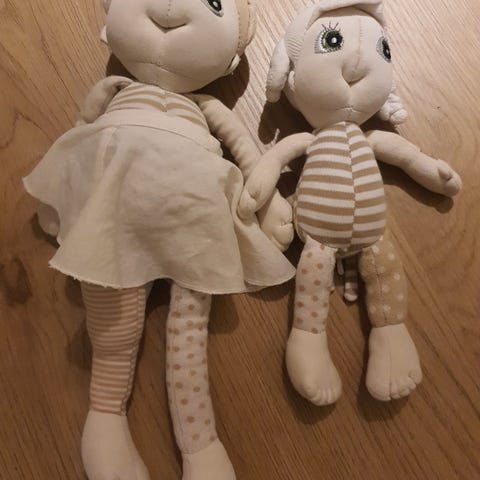 Rubens barn øko dukke sæt bestående af to bløde dukker i beige og hvid med stribet og prikket mønster. Dukkerne har tøjdetaljer som nederdel og er lavet til børn. Pris for begge