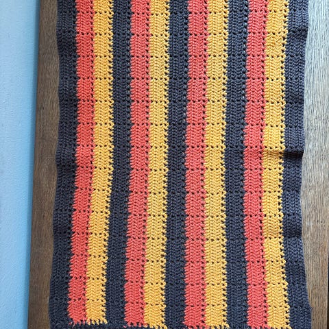 Et fint hæklet retro håndklæde i skønne orange & gule farver. Jeg kender ikke materialet, men det er blødt. Man kan ophænge det i øverste hæklet hul (kan ses på sidste foto). Håndklædet er velholdt.