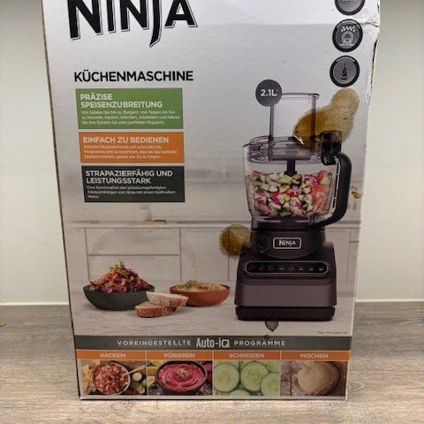 Fordele ved foodprocessor fra NinjaGør madlavningen hurtigere og mere fleksibel med Ninja Auto‑iQ BN800EU. Den kraftige motor på 1.200 W og op til 21.000 o/min giver effektiv blendning, hakning, skæring, rivning og purering - fra smoothies til salater og dej. Det digitale display med touchpad gør betjeningen enkel, og du kan nemt skifte mellem de medfølgende redskaber afhængigt af opgaven.Alsidig kapacitet til hverdag og gæsterDen rummelige foodprocessorskål på 2,1 l er ideel til familiemåltider, mens enkeltportionskoppen med tudlåg passer perfekt til hurtige to‑go drikke. Der medfølger isknusningsblad, hakkeblad, dejblad, Pro Extractor Blades‑samling samt vendbar skære-/riveskive, så du kan tilberede alt fra rå grøntsager til kolde drikke med is.Nem rengøring og praktisk brugAftagelige dele tåler opvaskemaskine, så oprydningen er hurtigt klaret. Maskinen har pulsfunktion, tænd/sluk-knap og klare indikatorer for en tryg og intuitiv oplevelse i køkkenet.Kraftig 1.200 W motor med op til 21.000 o/minStor 2,1 l skål samt praktisk enkeltportionskopFlere blade og vendbar skære-/riveskive til mange opgaverDigitalt display, touchpad og puls for præcis kontrolAftagelige dele tåler opvaskemaskineProdukttype: Foodprocessor/køkkenmaskineEffekt: 1.200 WMaks. hastighed: 21.000 o/minSkålkapacitet: 2,1 lFarve: Sort/sølvBetjening: Digitalt display og touchpad, pulsMedfølger: Isknusningsblad, hakkeblad, dejblad, Pro Extractor Blades, vendbar skære-/riveskive, skiveadapter, skubber, foodprocessorskål, enkeltportionskop ca. 0,7 l med tudlåg, kande Total Crush ca. 2,1 lOpvaskemaskine: Aftagelige deleSpænding: 220–240 V, 50–60 HzMål: H × B × D: 44,5 × 25 × 19 cmVægt: 4,34 kgMaterialeoplysning: BPA‑fri