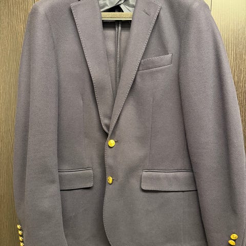 Ralph Lauren Blazer til mænd i størrelse L. Jakken er blå og lavet af bomuld. Den har klassisk blazerdesign med knapper på ærmerne og lommer foran. Jakken er egnet til formelle og afslappede lejligheder.