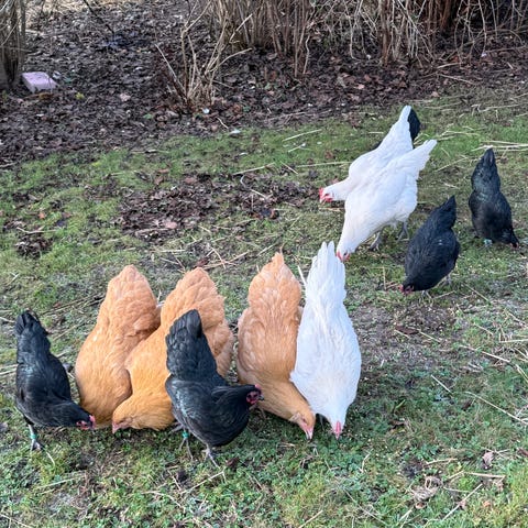 Blandede ung hønseflok med 7 høns og 2 haner bl.a med sussex og bielefelder fra sept.2025.