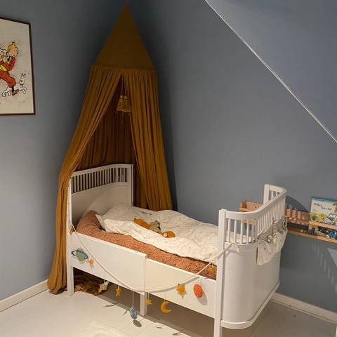 Sebra Tremmeseng til børn med tremmer. Sengens farve er blå, og den er designet til at give et sikkert sovemiljø for børn.