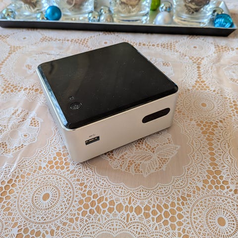 Intel NUC (Next Unit of Computing) Mini PC barebone-kit udstyret med en Intel Core i5-8259U processor, kendetegnet ved at være en lille, kraftfuld computerløsning, der kræver bruger-installation af RAM, lager og operativsystem.