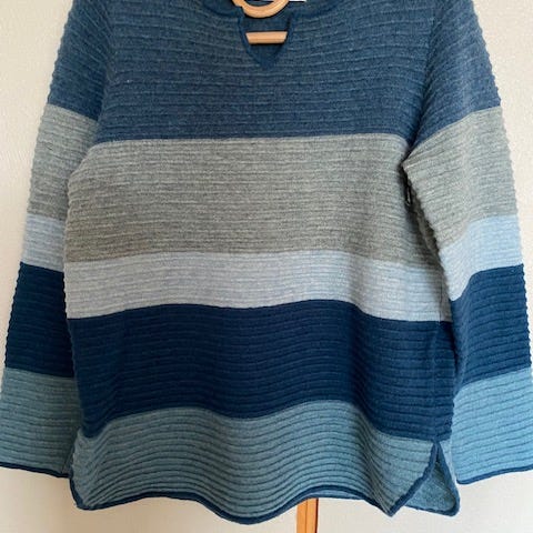 Grå Mansted, tynd trøje/ strikbluse, ren uld, str L. Knapper ned langs den ene side. Dejlig trøje, fin stand.