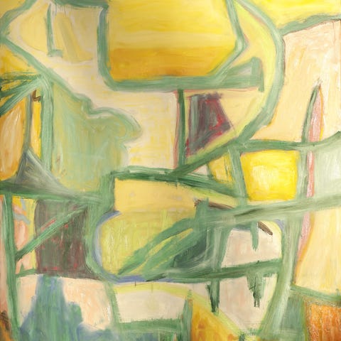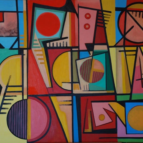 Abstrakt maleri med geometriske former i lilla, blå og hvide farver. Maleriet indeholder forskellige linjer og figurer, der skaber et komplekst og farverigt mønster.