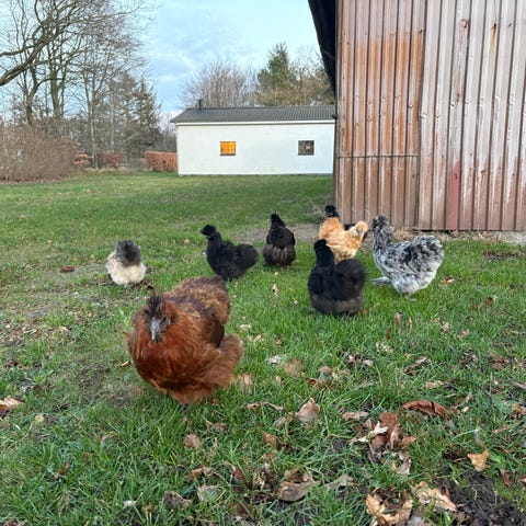 Dværg silke hane med to høner de alle unge fra forår 2025 .
