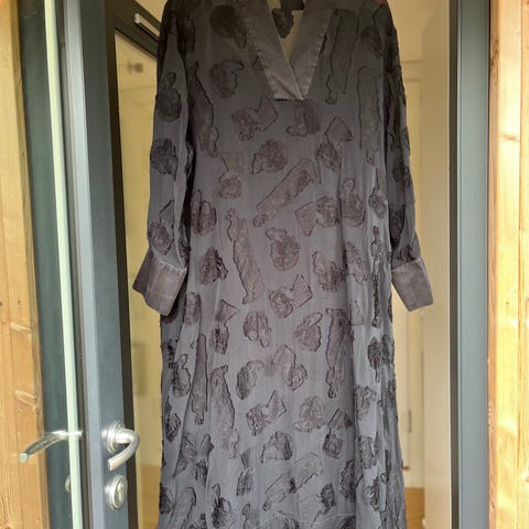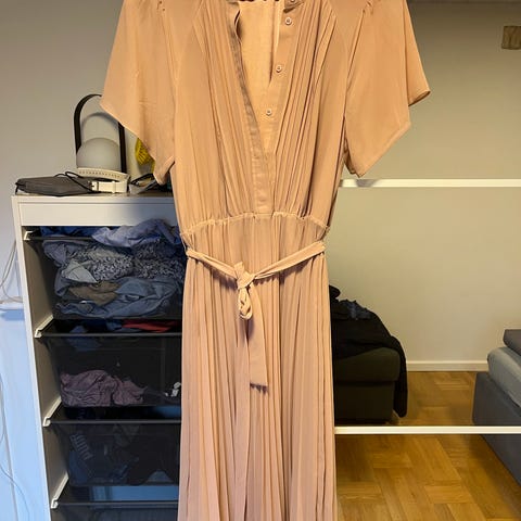 H&M Hverdagskjole i beige farve, størrelse L. Kjolen har knaplukning foran og en krave. Designet til kvinder.