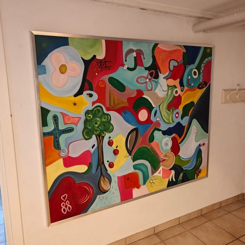 Farverigt abstrakt maleri med forskellige geometriske figurer og mønstre. Indeholder cirkler, firkanter og linjer i en kombination af varme og kolde farver. Velegnet til dekorative formål.