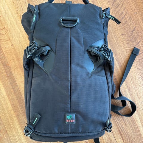 Kan bruges som rygsæk, skuldertaske eller håndtaske. God polstring og justerbare rum til kamera, objektiver og tilbehør.