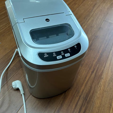 Severin isterningmaskine i sort farve. En elektrisk maskine til fremstilling af isterninger med gennemsigtig top og indvendig bakke til isterninger.