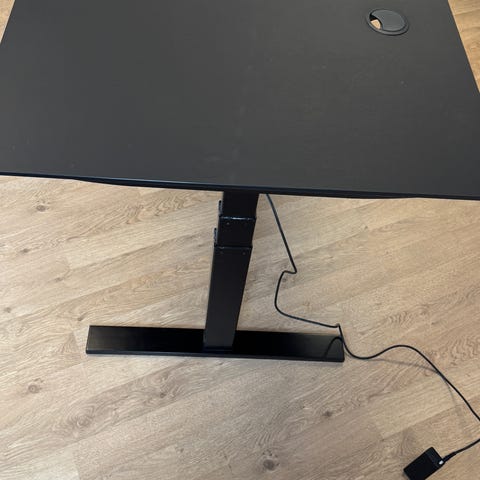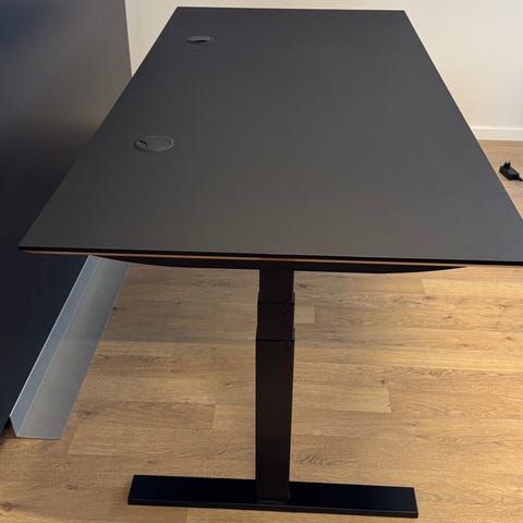 2 stk Holmriis - hæve-sænkebord med bordplade i bøgetræ og sort stel. Bordet måler 160 cm i længden og 80 cm i bredden. Designet til fleksibel brug med justerbar højde, egnet til kontor eller hjemmekontor.