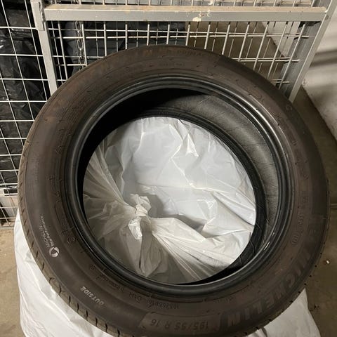 Dækkene har kun kørt én sæson, ca. 10.000 km, og har stadig 4–5 mm mønster tilbage. De er i rigtig pæn stand uden skader, lapninger eller ujævn slitage.