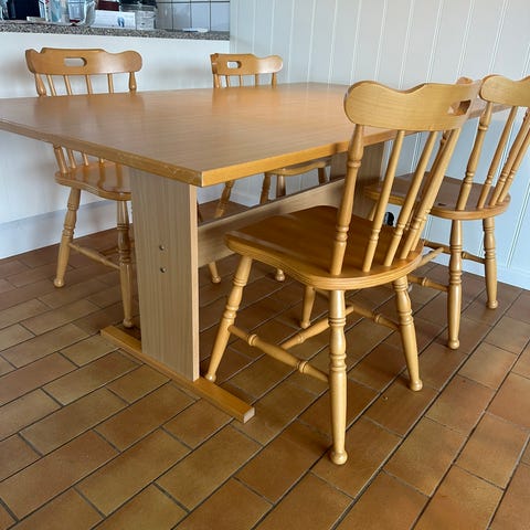 Spisebord inklusiv stole. Nok træ med kakler og to tillægplader