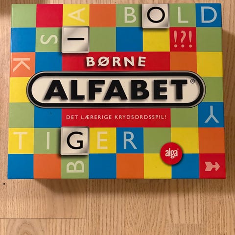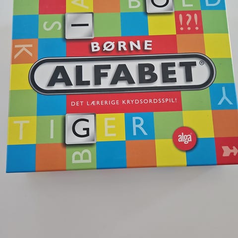 Alga Børne Alfabet krydsordsspil med farverigt design og bræt. Spillet indeholder bogstaver og en spilleplade til krydsordsspil og en blok at skrive resultater på. Indeholder to versioner af spillet; et for børn der ikke kan læse endnu og et for børn der har lært at læse. Regelsættet er blevet væk, men findes nemt på nettet.
