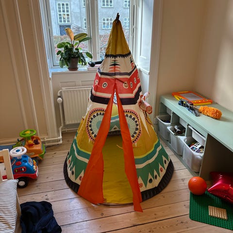 Jollyroom børnetelt i brun farve. Teltet har en trekantet form med åbning foran og dekorative pomponer langs kanten. Materialet er tekstil, og teltet er egnet til indendørs brug som et legeområde for børn. Teltet leveres med en blød måtte indeni for øget komfort.