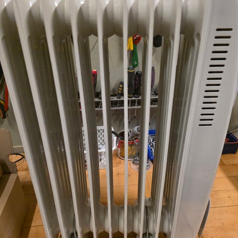 olieradiator 9 ribber med timer og blæser og hjul. 2000w 230v 50Hz, der er rust på hjul