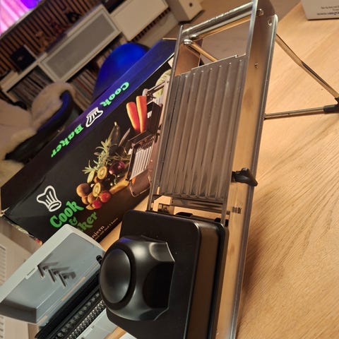 Fresh Food Mandolinjern med 4 skæreknive, 3 indbyggede beholdere og skæreværdier fra 0,5 til 8 mm. Produktet er foldbart for nem opbevaring og tåler opvaskemaskine. Inkluderer beholdere, skubbe del, trygt til påsætning og rengøringsbørste.