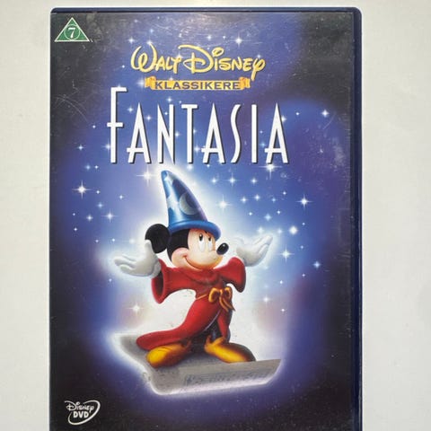 Walt Disney Fantasia DVD med klassisk animationsfilm. Indeholder filmen Fantasia fra 1940, kendt for sin kombination af klassisk musik og animation. DVD'en har originalt cover med Mickey Mouse som troldmand. Sprog og yderligere tekniske detaljer fremgår af emballagen.