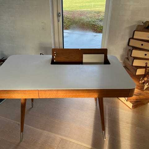 Det moderne skrivebord gemmer på et væld af diskrete finesser, som kabelhuller i bordpladen samt skjult ledningsføring gemt i bordet. ledningerne kan organiseres under rummene under bordet. Der kan trækkes ledning gennem benbukkene. Skufferne er sinket flot sammen med svalehaler. Den varme glød fra træet står i et flot samspil med de smalle ben i rustfrit stål, der giver det store skrivebord et næsten svævende udtryk. Det rustfrie stål går igen på skuffefronterne, med de lange, slanke og stilrene greb.
