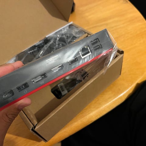 Lenovo docking station med 65 watt oplader og ekstra HDMI-HDMI kabel.