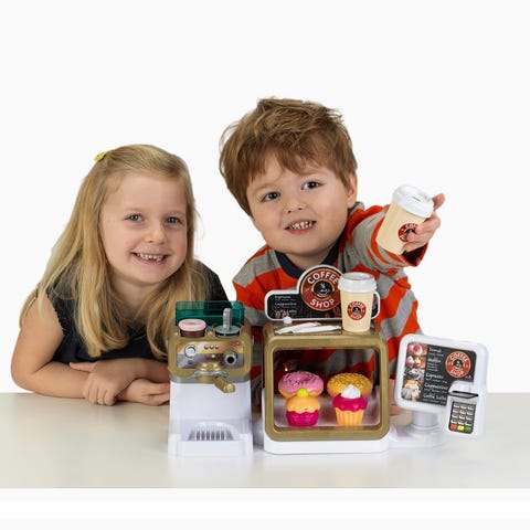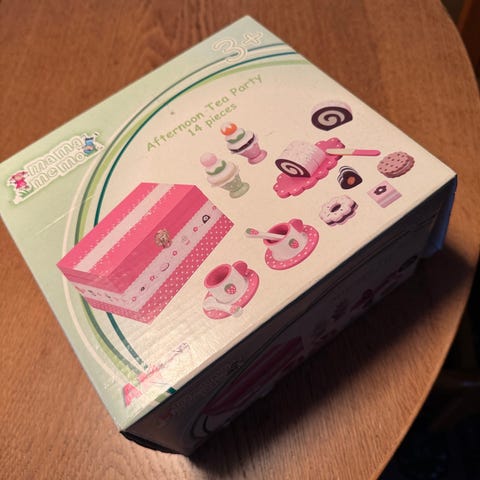Der medfølger, 2 kopper, 3 kager og kagekrukke, 1 mælk og kaffeholder.