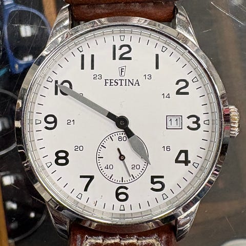 Festina herreur med sort urskive og sort læderrem. Uret har chronograph funktion og tachymeter på urskivens kant. Designet til mænd.