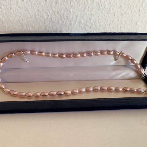 Jeg sælger en helt ny perlekæde bestående af 56 smukke, glansfulde perler i en elegant cremehvid farve.